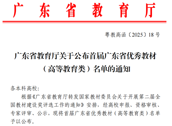 近日,广东省教育厅完成了首届广东省优秀教材(高等教育类)的评选工作,公示期已顺利结束,正式名单尘埃落定。米兰体育平台官方网站在此次评选中表现卓越,两部教材成功入选,这无疑是学校教育教学工作的重大成果,彰显了我校在教材建设领域的深厚底蕴与强劲实力。