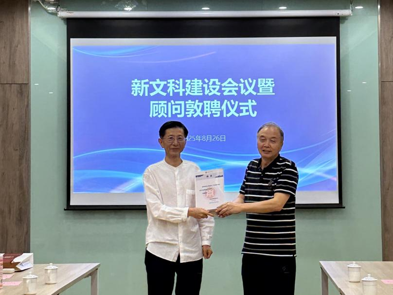 会议分两阶段开展,首先由陈少华教授主持顾问敦聘仪式,宣布聘任朱文教授为新文科建设分委员会顾问,并由王列耀教授为其颁发聘书。