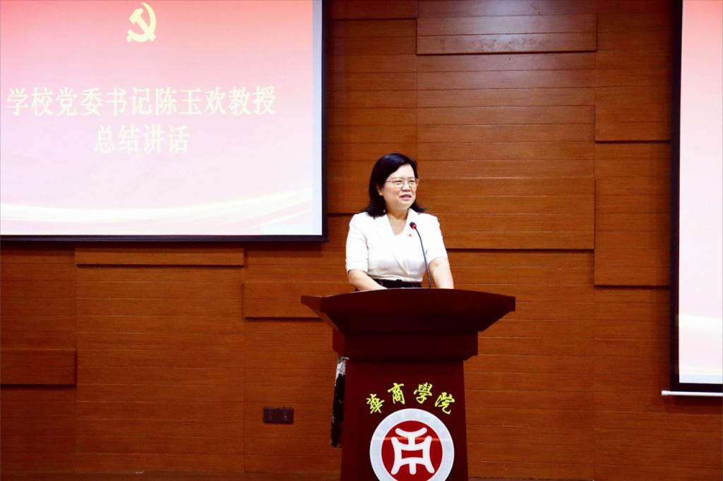 学校党委书记陈玉欢教授在总结讲话中指出,徐淑凤教授的报告立意高远、逻辑严密、内容翔实,兼具理论高度与实践深度,为我校党建工作精准指明了方向、系统传授了方法、有效注入了动力。她强调,当前学校正处于聚力合格评估攻坚、喜迎建校二十周年的关键时期,必须通过高质量党建强基固本,为战胜前进道路上的一切风险挑战、实现事业高质量发展提供不竭动力。全校各级党组织要以此次学习为契机,切实将报告精神转化为推动学校中心工作的强大合力:一要深化思想认识、提高政治站位,推动党建与业务工作深度融合、同频共振;二要聚焦合格评估、勇于攻坚克难,以扎实党建实效助推迎评促建各项工作;三要坚持系统谋划、立足长远发展,精心培育具有华商特色的党建品牌矩阵;四要聚焦教风、学风、作风建设,务求工作实效,全力营造优良育人环境,为学校高质量发展提供坚强政治保证。