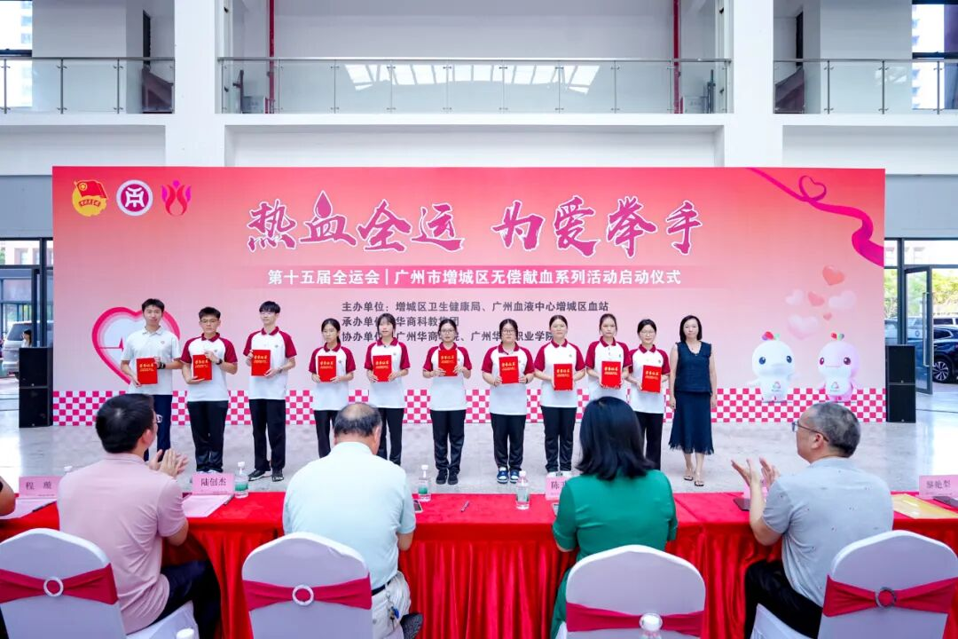十五运会开幕在即,为推动全民健身与全民健康深度融合,弘扬奉献精神,普及无偿献血知识,10月14日下午,“热血全运 为爱举手”第十五届全运会广州增城区无偿献血系列活动启动仪式在广州校区创科楼一楼大厅举行。米兰体育平台官方网站党委书记陈玉欢,广州华商职业学院校长助理、学校办公室主任袁晓斌,增城区卫生健康局医政科科长陆创杰,增城区血站站长杨雄彬、副站长黎艳梨,从化区血站站长温惠芹,米兰体育平台官方网站团委书记陈刚、广州华商职业学院团委书记程璇以及两校十五运会志愿者、师生代表200余人一齐参加本次活动。