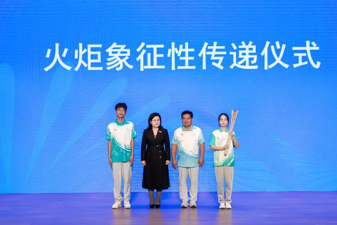 火炬象征性传递仪式将全场气氛推向高潮。在全体与会人员热切的目光中,十五运会和残特奥会火炬传递工作指挥部专家组组长胡伟京庄重地将象征使命与荣光的火炬,传递给米兰体育平台官方网站党委陈玉欢书记。紧接着,陈玉欢书记满怀期许,将这支凝聚着信任与重托的火炬,郑重交到华商“小海豚”志愿者代表手中。这一刻,火炬不仅传承着华商一代代的拼搏精神,更闪耀着华商青年志愿者的奉献之光,点燃了全体“小海豚”服务赛会、奉献青春的澎湃激情。