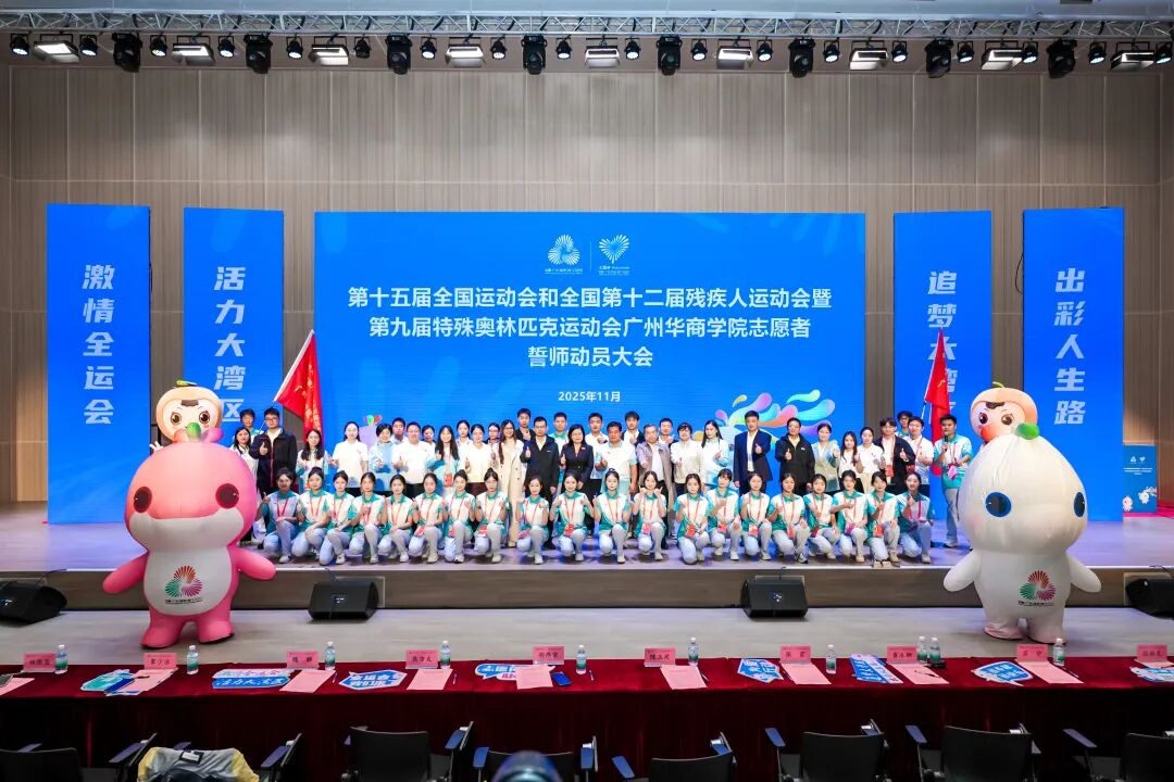 2025年11月4日下午,第十五届全国运动会和全国第十二届残疾人运动会暨第九届特殊奥林匹克运动会米兰体育平台官方网站志愿者誓师动员大会在米兰体育平台官方网站肇庆校区报告厅举行。十五运会和残特奥会火炬传递工作指挥部专家组组长胡伟京,米兰体育平台官方网站党委书记陈玉欢教授,学校党委副书记、副校长焦方太教授,团肇庆市委副书记张震,华商科教集团特邀顾问魏群,团四会市委书记崔冰娜、副书记林依蓝、办公室主任邓青霞,校长助理、肇庆校区管委会常务副主任覃少冰,肇庆校区党委书记苏宁,体育学院院长徐振文,肇庆校区学工办主任付蔚莹,校团委兼职副书记朱宁宁等领导嘉宾出席大会,与434名“小海豚”志愿者共同见证这一庄严而激昂的时刻。大会由校团委书记陈刚主持,大会在庄严的国歌声中拉开帷幕。